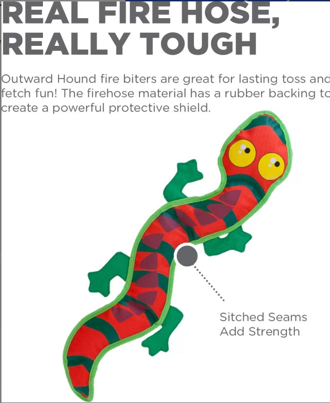 Plush play lasts longer with the Outward Hound Fire Biterz Gecko Plush Firehose Material Interactive Dog Toy. This durable plush is crafted with a special k9 tuff lining, firehose material, and a signature Outward Hound squeaker that endures hours of play. Plus, it’s stuffed with plenty of polyfill, so your pup still has something to sink their teeth into. Fire Biterz are a standout addition to your furry friend’s toy collection. Get your pup fired up for fun with Outward Hound!